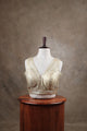 Ethereal and graceful, MEGALAI is a tissue Banarasi blouse woven in subtle rose-gold tones. Its shimmering stripes and deep neckline exude quiet luxury, while the option of attachable sleeves offers versatile styling. Perfect for festive drapes and wedding soirées.