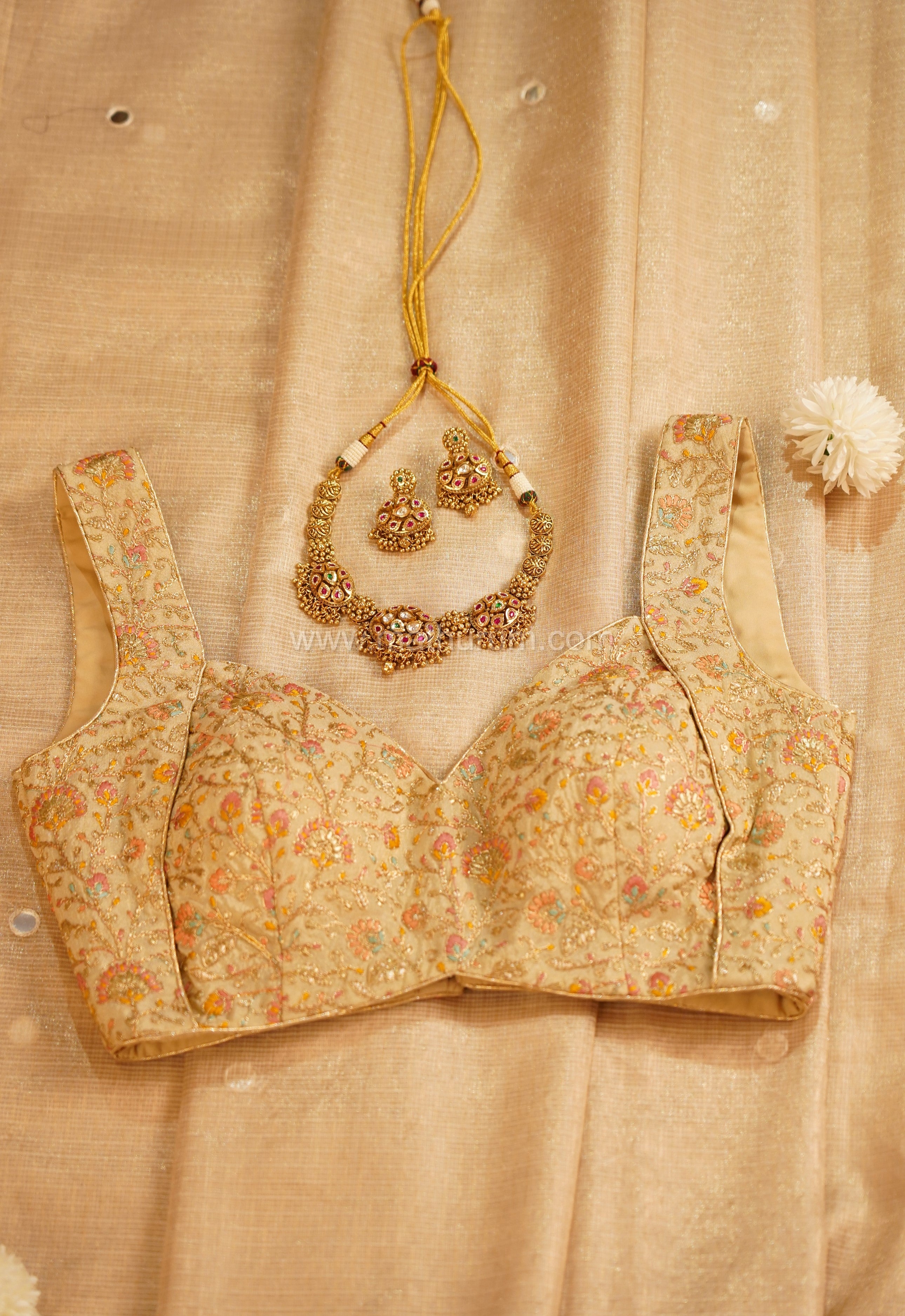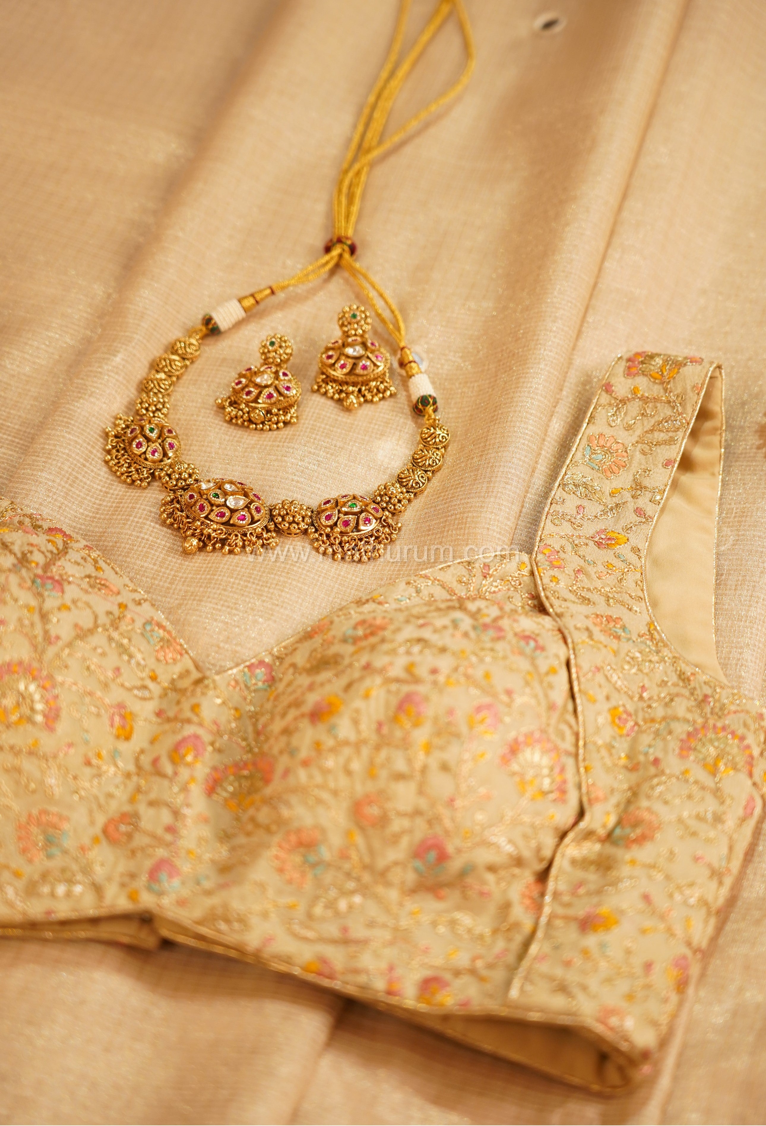 The Chandhanam Kota Silk Saree, in its soft golden-beige glow, embodies timeless tradition and understated elegance. Its feather-light drape and subtle shimmer make it the perfect festive weave for Onam. Paired with the Apsara Blouse, an exquisitely embroidered piece adorned...