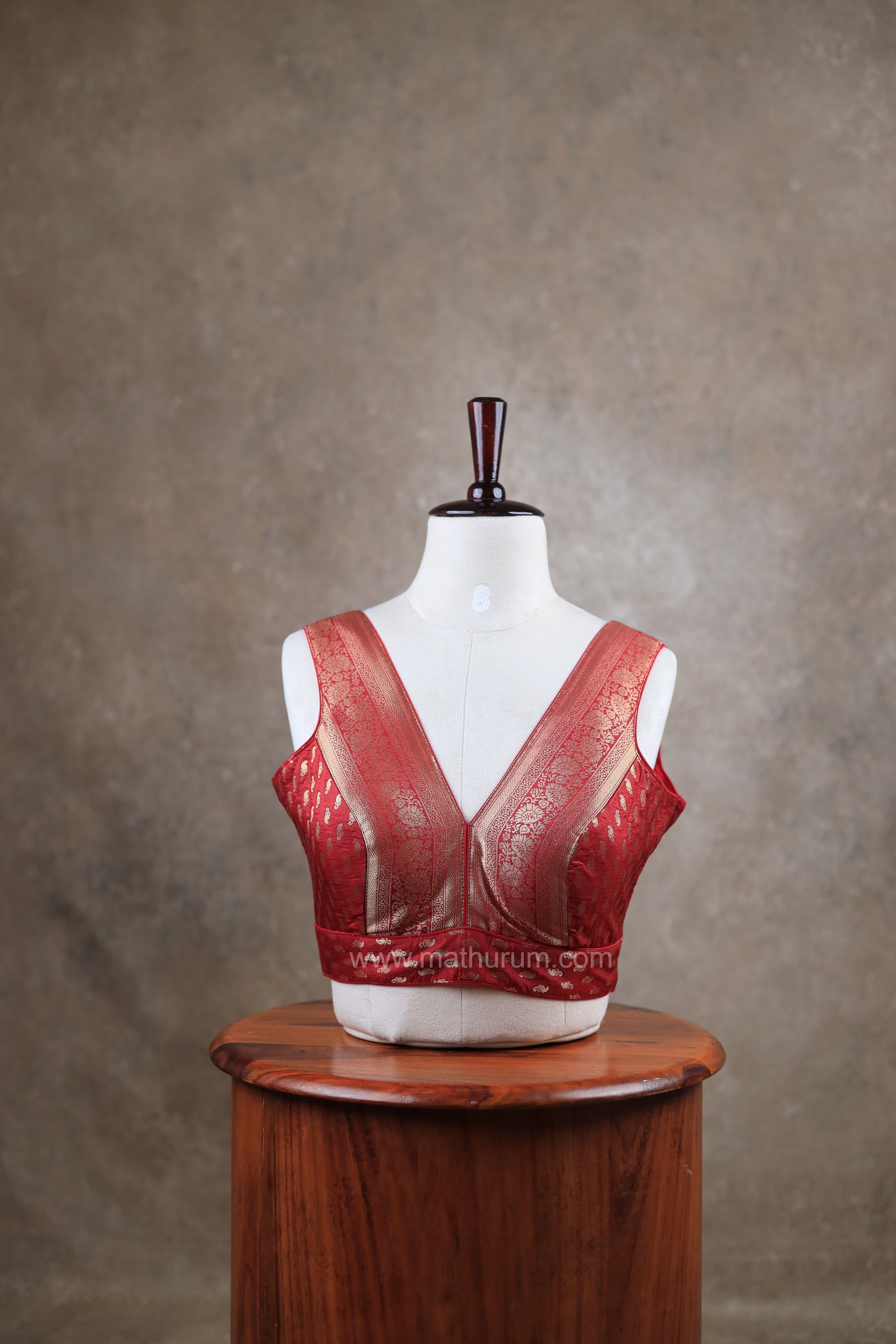 Regal and versatile, KUNDHAVAI is a classic Banarasi brocade blouse in a deep, rich hue with golden motifs. Designed with a bold V-neckline and an option for attachable sleeves, it beautifully balances tradition and modern style — ideal for weddings,...