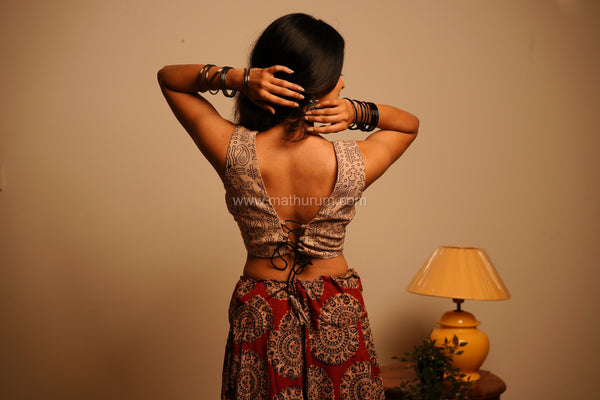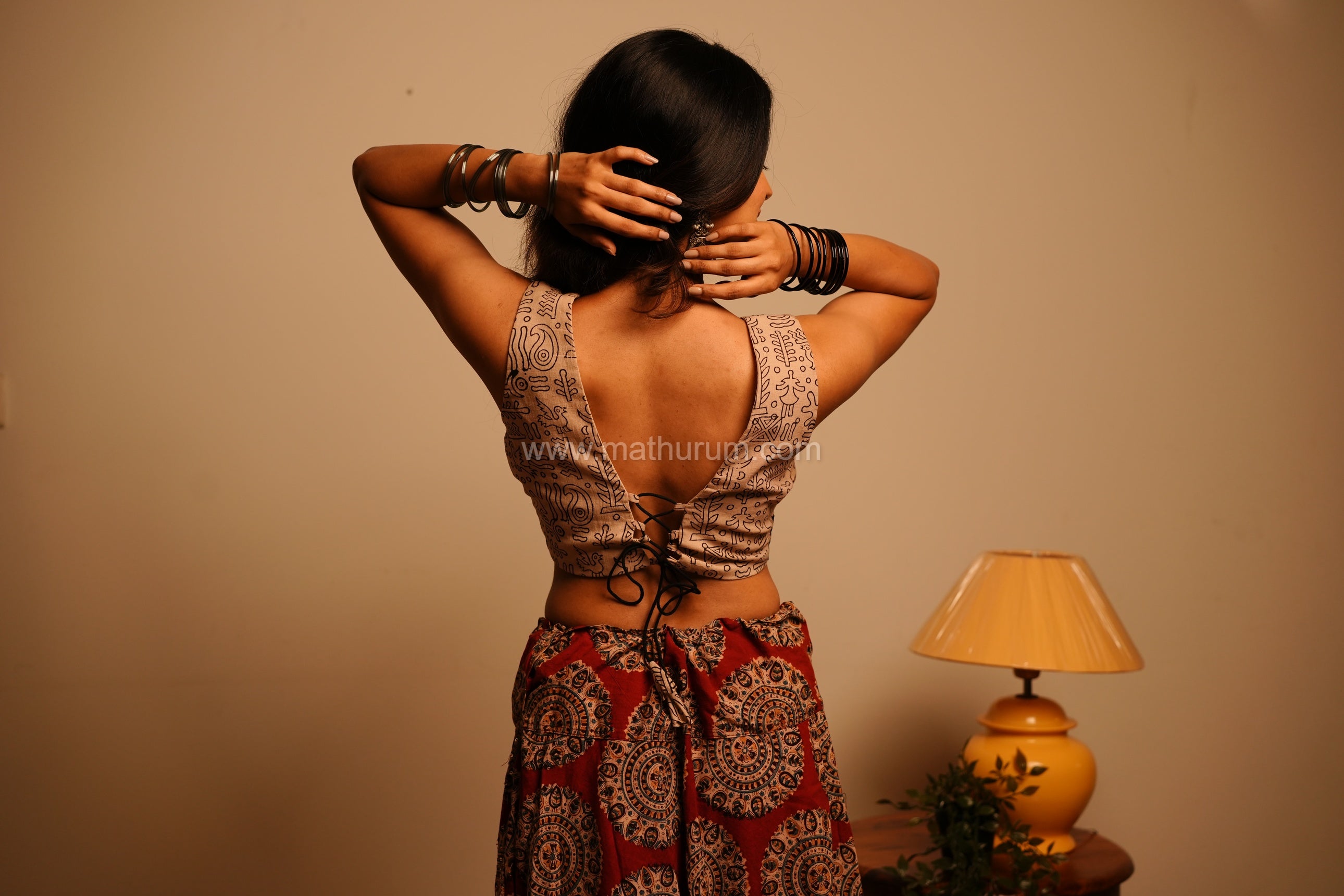 Playful yet poised, Saaya is a sleeveless cotton blouse that brings together tribal-inspired artistry and a striking silhouette. The front features a deep V-neckline with a contrast black base and earthy beige panels adorned with abstract line motifs, echoing indigenous...